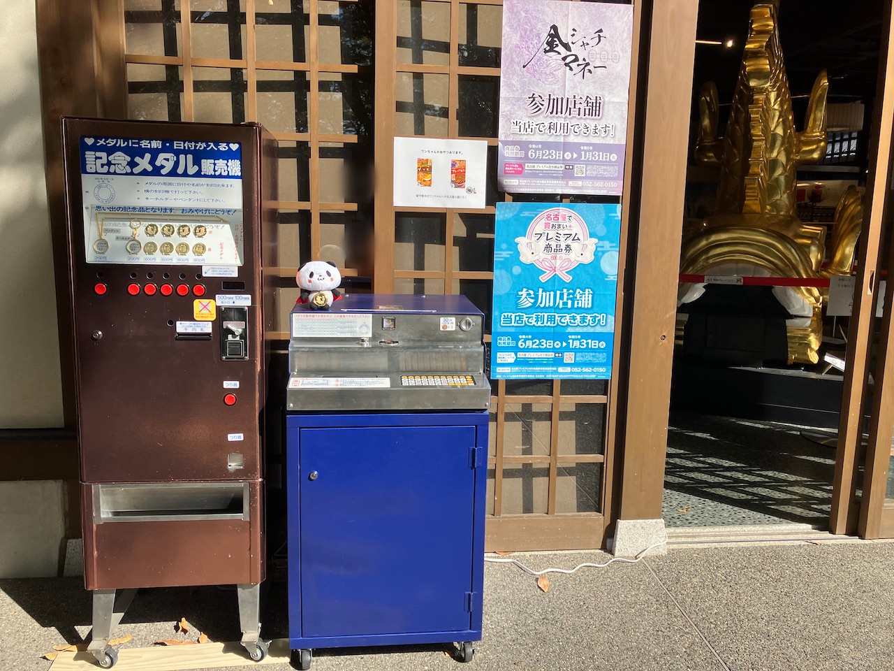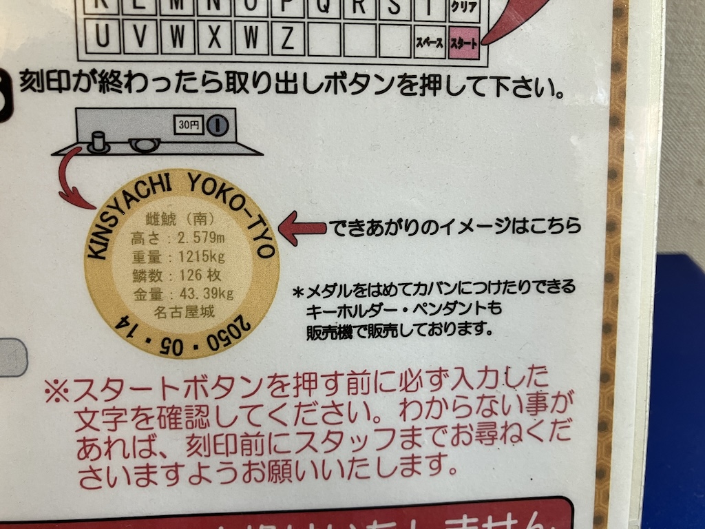 実に久しぶりの販売機&刻印機設置の新メダルスポット(常設)の誕生にテンションアゲアゲ↑↑で足を運んだため、徳川家の人を見たり路駐の多さの秘密を語ったり走ったりと無駄に長い記事となってしまった。皆様方におかれましては、【名古屋城】にそびえる金鯱に逢えぬ今、その形代としてこのメダルを手に入れに来て、金シャチ横丁にて名古屋飯などを食していただくのがよろしいのではないかと思います。NAGOYAへようこそ!