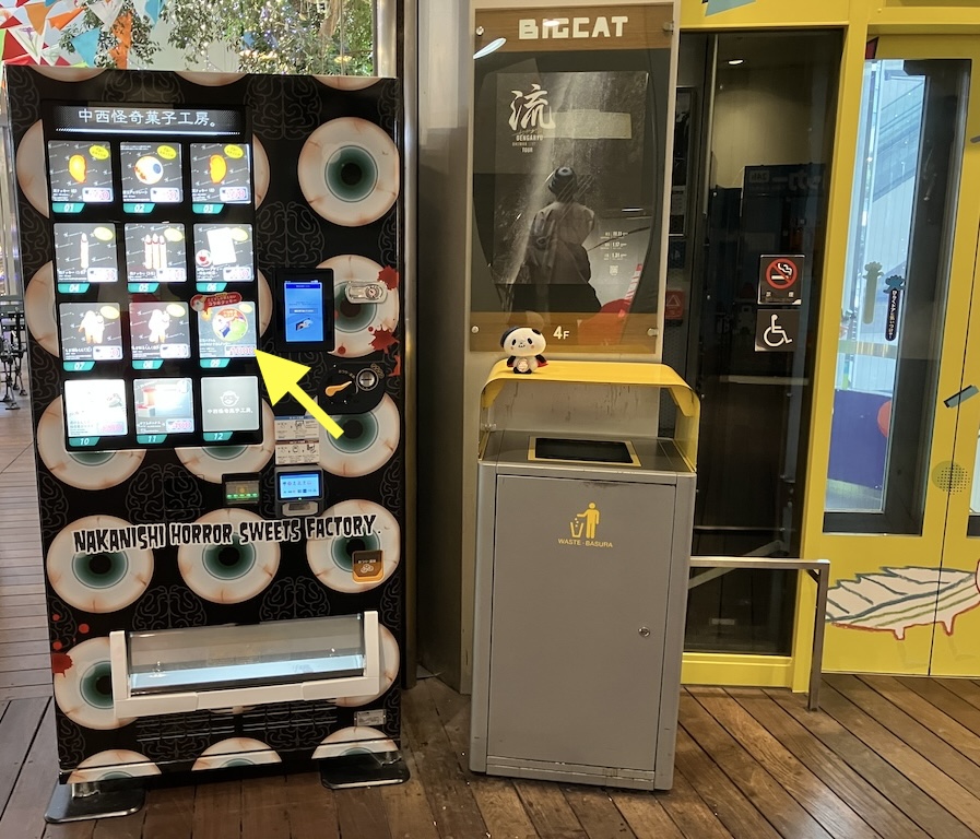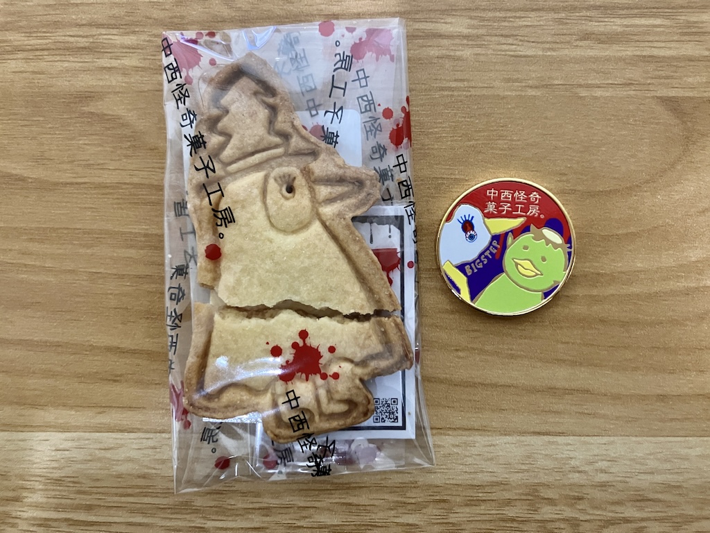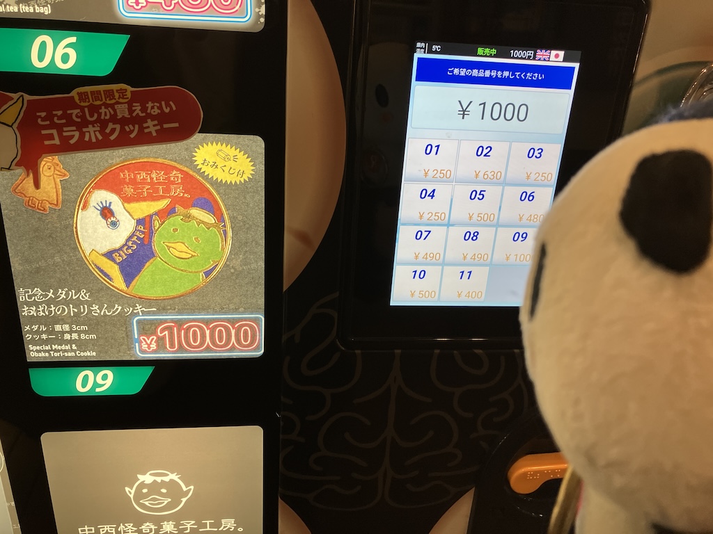個人的にその際たる象徴だと感じるのが、この抱き合わせ販売である。記念メダル販売機の右隣に新設されたこの「中西怪奇菓子工房」とやらのお菓子の自動販売機で、記念メダルとクッキー1枚のセットが1000円という価格で売り出された。