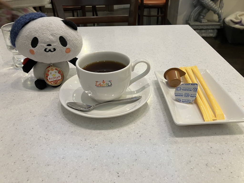 食後には、現行販売メダルコンプリーターの方がおすすめしていたインドコーヒーを飲んでみた。他のコーヒーとの違いはよくわからないけれど、コーヒーとして美味しかったです。
