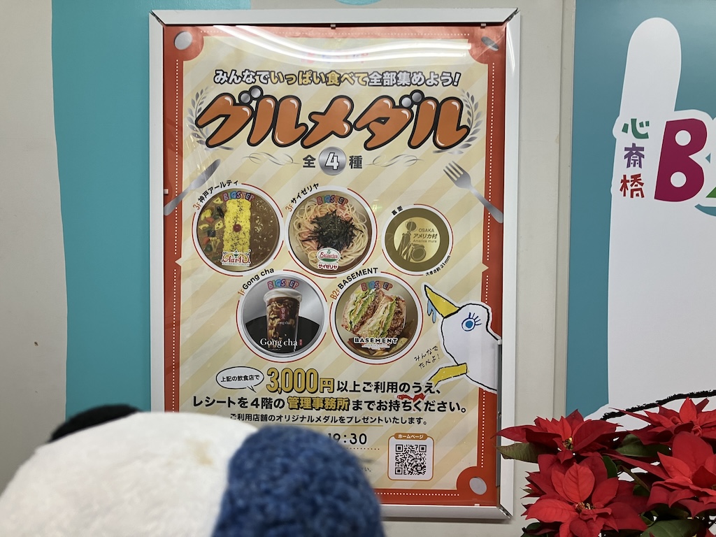 この【グルメダル】という企画は「【心斎橋ビッグステップ】の(スタバ以外の)飲食店で3000円以上飲食すると記念メダルがもらえるよ!」というものである。個人的には”3000円”という価格帯に商魂逞しい大阪魂を感じていて、例えば「飲食店のレシート持参でメダル1枚プレゼント!」という感じの、生ぬるい来店を促進するための赤字も織り込み済み販促サービス企画というわけではなく、記念メダルの原価分も絶対に回収するという強い意志を感じる”3000円”である。商売をする上で損をしない設計というのは非常に大切である(お店と管理事務所の負担割合は不明であるが)。