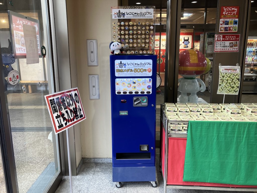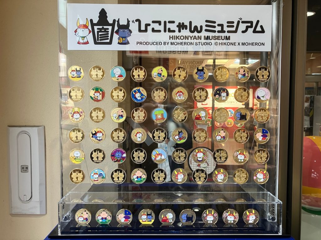 【ひこにゃんミュジアム】はあの”青い販売機”でくじ引き方式販売を始めるという歴史に名を刻んだ記念メダルスポットである。そんなわけで、多くのダブりメダルを生み続ける罪深き販売機である。しかし私はその罪深さの恩恵も受けていて、この施設を訪れる前からダブったメダルを複数譲り受けていた。つまり記事トップ掲載のメダルは、ほぼ全てがいただき女子もびっくりなほどの頂き物である。