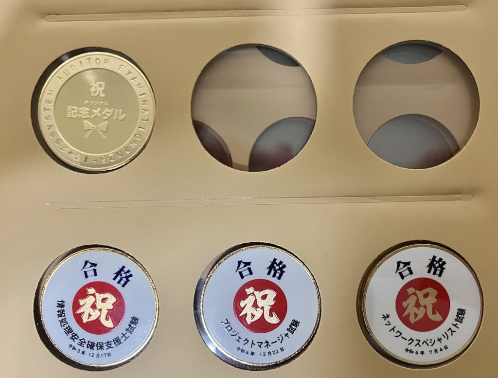 私は今まで、「高度試験」に合格するたびに茶平工業公式通販から「寿メダル」を購入していた。注文の際には裏面の文字入れを自由にできたので、合格した資格の名称と合格日を記載してた。