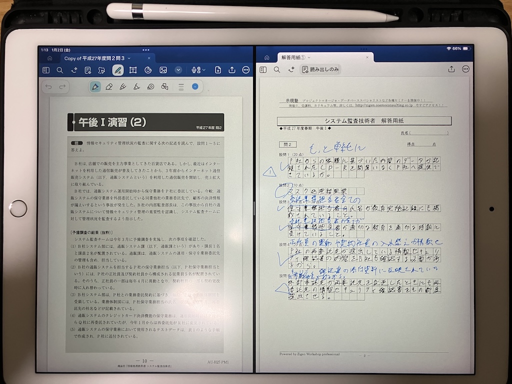 13インチiPad(デカい)なので、ストレスなく問題用紙と解答用紙との2画面分割ができる。