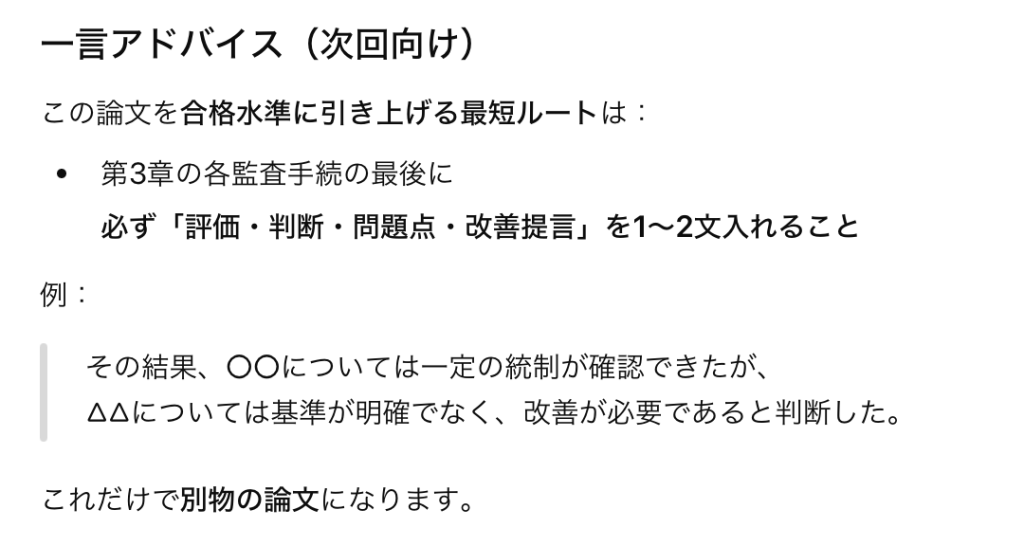 午後Ⅱ試験の対策としては、やはり1度は練習で論文を書き上げてみる方がよいと考えている。そして現在は生成AIが合否判定に加えて非常に詳細な添削もしてくれるので、大手予備校の論文添削サービスを利用せずとも自分が書いた論文のレベル感がなんとなく把握できる。便利な世の中になったし、”AIが仕事を奪う”ってのはこういうことなんだなとも実感できる。ちなみにchatGPTに論文3本を厳し目採点してもらったが、「合格だよきみぃ!」と言われたのは1本だけであった。そして不合格論文へのアドバイスがまた適切なんだなぁ……