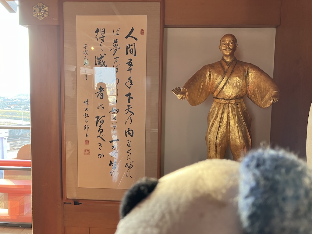 城内の展示としては、「清洲城の歴史」と、中部圏のお城ではありがちな「信長と愉快な仲間たちとの歴史」といったところを説明するラインナップとなっている。清洲城はとりわけ信長推しな印象。「人間五十年 下天の内をくらぶれば 夢幻の如くなり」という信長が好んで舞ったという幸若舞『敦盛』の一節をやたらと推していた。ちなみに冒頭の「人間五十年」を「昔の人間は寿命が短かくて50歳くらいで死んだから、人間の寿命なんて夢や幻のように儚いよね」みたいに解説している人を見たことがあるが、これは明らかな間違いである。「人間」は「じんかん」と読み、これは”この世界”という意味である。「下天」というのは天界の中で最も人間界に近い最下層の世界を意味し、ここでは1日が人間の世界の50年に相当するのである。つまり「人の世の50年なんて、天界で流れる時間と比べたら夢や幻のように一瞬だよね〜」みたいな話である。